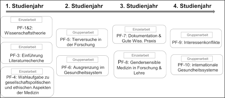 Um kritisches Denken, Quellenarbeit und wissenschaftliches Schreiben stärker zu verankern, wurde aus dem Lehr- und Prüfungskanon der MHH das wenig genutzte Assessment-Portfolio für die Beurteilung der Lernleistung gewählt. Dieses wird definiert als „[…] kursbegleitende, schriftlich-ausformulierte Leistungskontrolle. Es dient vor allem der Überprüfung der Entwicklung von Fähigkeiten und Fertigkeiten sowie Einstellungen bzw. Haltungen. […]“ [23]. Der darauf aufbauende Grundgedanke ist, in einer longitudinal verankerten Modulform (in den Studienjahren 1-5) den Studierenden jährlich 2-3 Assessment-Portfolio-Aufgaben zu stellen, die über einen Zeitraum von 4-8 Wochen selbständig schriftlich zu bearbeiten sein sollen. Die Aufgabenstellungen, die sowohl Einzel- als auch Gruppenaufgaben beinhalten, werden digital über die Lernplattform ILIAS bearbeitet, so dass sie – analog zu den elektronischen Prüfungen [24] – als „ePortfolio-Aufgaben (ePF-Aufgaben)“ und in ihrer Gesamtheit als „eAssessment-Portfolio (ePF-A)“ bezeichnet werden. Thematisch werden u. a. Aspekte der Wissenschaftstheorie, der Literaturrecherche und der Guten Wissenschaftlichen Praxis (GWP) adressiert, aber auch Fragestellungen zu Entwicklungsprozessen im Gesundheitssystem (siehe Abbildung 1 [Abb. 1]). Alle Aufgaben werden vorab von Studierenden getestet, um Verständnisbarrieren zu beseitigen und Einschätzungen zur Bearbeitungszeit zu erhalten.