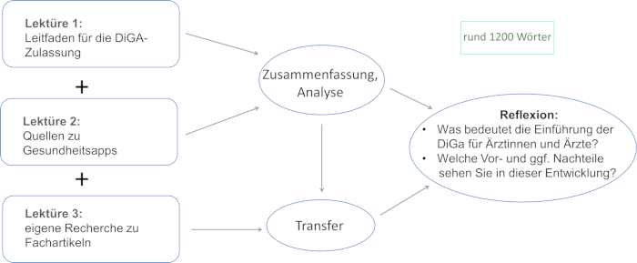 Am Beispiel der Auseinandersetzung mit Digitalen Gesundheitsanwendungen (DiGA) werden Grundlagen der Textlektüre und der Zusammenfassung wissenschaftliche Publikationen, die eigenständige Quellenrecherche und die Reflexion bzw. Diskussion der Ergebnisse eingeübt.