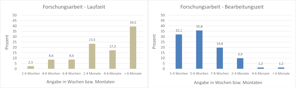 Bei der zeitlichen Dimension der Forschungsarbeit wurden sowohl die reine Arbeitszeit als auch die Laufzeit erfragt. Dabei zeigte sich, dass rund zwei Drittel die anvisierten sechs Wochen für die Bearbeitung einhalten konnten (siehe Abbildung 5 a [Abb. 5]) – diese verteilten sich aber in der Regel über einen längeren Zeitraum, zumeist als semesterbegleitende Phasen unterschiedlicher Dauer und Intensität (siehe Abbildung 5 b [Abb. 5]).