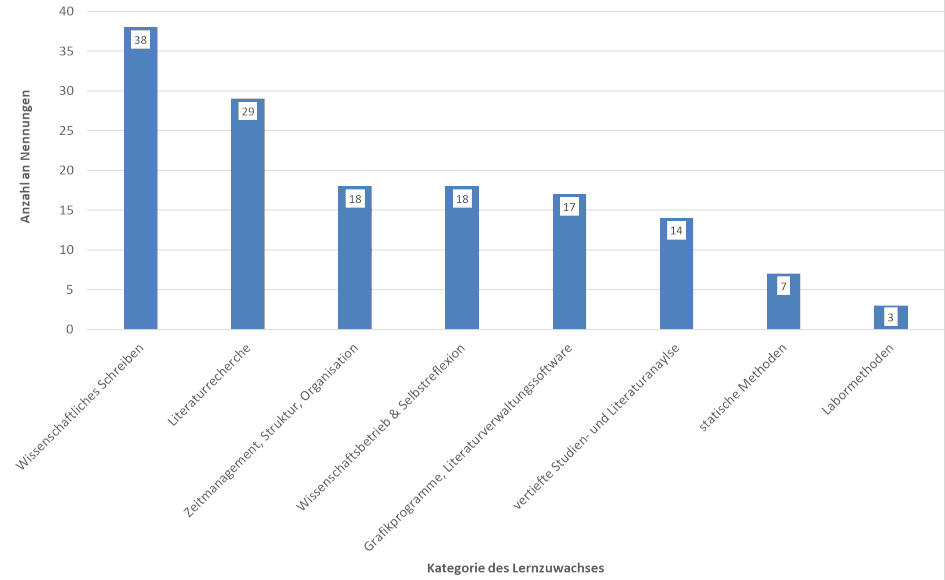 Abbildung 6: Selbst eingeschätzter Lernzuwachs im Rahmen der Forschungsarbeit – inhaltliche Kategorien (auf der Basis von stichpunktartigen Freitextangaben von n=61 Studierenden mit n=144 Aspekten)