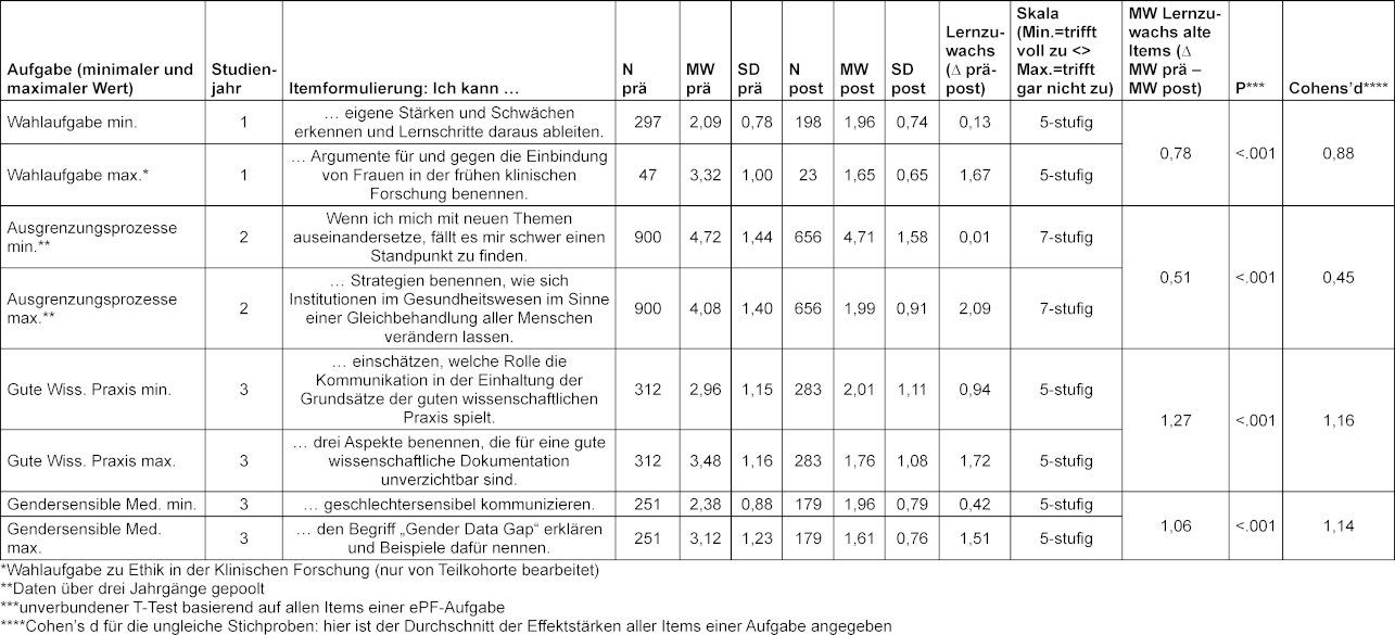 Für jede ePF-Aufgabe werden zwischen 9 und 15 Items zur Beantwortung vor und nach der Aufgabenbearbeitung vorgegeben. Die Skala basiert auf fünf bzw. sieben Stufen mit den Polen „Min.=trifft voll zu“ <> „Max.=trifft gar nicht zu“. Dargestellt sind der minimale und maximale Lernzuwachs für Items aus jeder ePF-Aufgabe, sowie der Lernzuwachs für alle Items einer Aufgabe anhand des Delta (prä-post). Statistische Signifikanz wurde anhand des T-Tests für unverbundene Stichproben auf der Basis der prä-post-Items der jeweiligen Aufgabe ermittelt. Als Effektschätzer wurde Cohen’s d berechnet (hier als Durchschnitt der Lernzuwachs-Effektstärken der Items einer Aufgabe). Cohen schlägt eine Abstufung in d=0,20 (kleiner Effekt), d=0,50 (mittlerer Effekt) und d=0,80 (großer Effekt) vor.