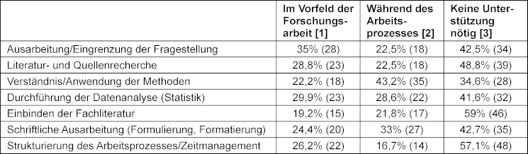 Mit Blick auf die Vorbereitung auf die Forschungsarbeit und den Zeitpunkt der gewünschten Unterstützung wurden differenzierte Rückmeldungen gegeben. Während im Vorfeld der Arbeit bei der Eingrenzung der Fragestellung bei rund einem Drittel ein Unterstützungsbedarf vorhanden war, wurden während des Arbeitsprozesses in erster Linie methodische Aspekte sowie die schriftliche Ausarbeitung als schwierig empfunden (siehe Tabelle 2 [Tab. 2]).