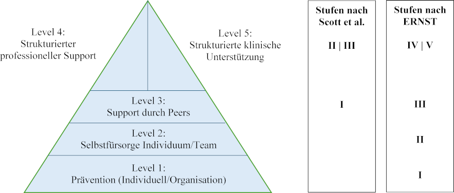 Die Abbildung zeigt fünf hierarchisch aufgebaute Ebenen zur psychosozialen Unterstützung, beginnend bei präventiven Maßnahmen bis zu strukturierter klinischer Unterstützung, und orientiert sich hierbei am Stufenmodell von S. Scott et al. und am European Researchers’ Network Working on Second Victims [98], [100].