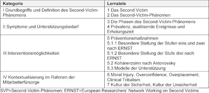 Ergebnisse: Die Analyse resultierte in der Definition eines Rahmenkatalogs, der vier Teilkategorien umfasst: I: Grundbegriffe und Definition des Second-Victim-Phänomens, II: Symptome des Second-Victim-Phänomens und Bedarf an Unterstützung, III: Interventionsmöglichkeiten und IV: Kontextualisierung des Second-Victim-Phänomens im weiteren Spektrum der Mitarbeiterfürsorge. Diesen Kategorien wurden sieben Wissensbereiche zugeordnet und auf dieser Basis wurden sieben Lernziele mit den jeweiligen Kompetenztiefen definiert.
