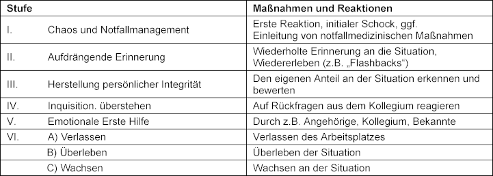 Die Tabelle beschreibt sechs typische Reaktions- und Verarbeitungsstufen nach einem belastenden Ereignis nach S. Scott [50]. *Inquisition wurde hier aus der Originalarbeit übernommen. Gemeint sind hier belastende, Rückfragen aus dem Kollegium aber auch Fragen wie: „behalte ich meinen Arbeitsplatz“.