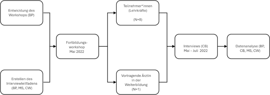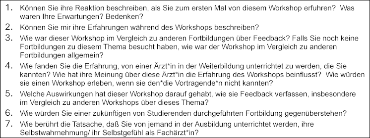 Die Fortbildungsveranstaltung bestand aus einem zweistündigen Workshop für onkologische Fachärzt*innen an einem akademischen Lehrkrankenhaus in Ontario, Kanada, and dem Autor*innen MS und CJW als Onkolog*innen tätig waren. Autorin BP entwarf und leitete (nach den pädagogischen Prinzipien von Gagne [21]) den Workshop als sie in ihrem 2. Jahr der Facharztausbildung war (5 Jahre nach Abschluss des Basis-Medizinstudiums in Kanada). Nach einem interaktiven Vortrag fanden simulierte Feedback-Szenarien statt, wo ein*e Medizinstudent*in schriftliches Feedback zu einer vom Fachärzt*in beobachteten Patient*innenuntersuchung erhält. Die Fortbildung war für alle Onkolog*innen offen; Teilnahme an der Studie war freiwillig. Rekrutierung geschah durch eine vor der Fortbildung verschickte eMail. Innerhalb weniger Tage nach der Fortbildung nahmen diejenigen Fachärzt*innen, die an der Studie teilnehmen wollten (n=8), an einem Interview teil, in dem sie zu ihren Erfahrungen (Gedanken, Gefühle) während des Workshops befragt wurden (siehe Abbildung 1 [Abb. 1]). Das Interview wurde von Autorin CB durchgeführt, die zwar Ärztin, aber noch keine fertig ausgebildete Onkologin war und auch nicht an dem Workshop teilgenommen hatte. Die transkribierten aufgezeichneten Interviews wurden anonymisiert (siehe Tabelle 1 [Tab. 1]). Ein Teilnehmender (MS) war gleichzeitig auch Mitglied des Forschungsteams und Betreuer von BP während ihres Studiums. BP wurde auch von CB interviewt.
