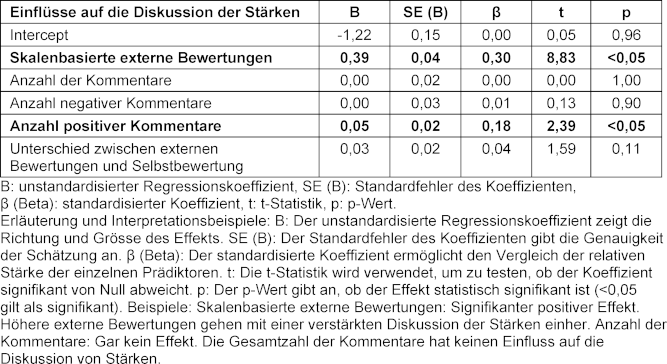 Höhere skalierte externe Bewertungen pro Item (Β=0,39, β=0,30, p<0,05) erhöhten die Wahrscheinlichkeit, dass das Thema als Stärke angesprochen wurde, signifikant.