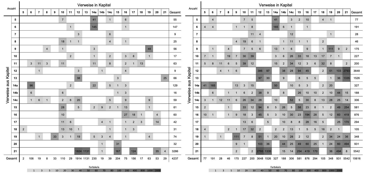 Abbildung 2: Kreuztabellen der Querverbindungen zwischen den Kapiteln vor und nach der ersten Intervention, links NKLM 1.0, rechts NKLM 1.0 (neo)