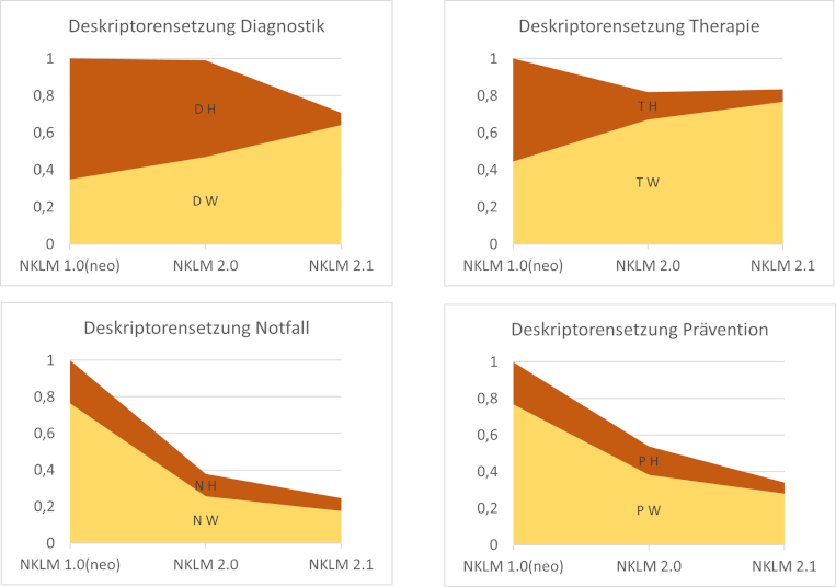Für jeden gesetzten Deskriptor wird jeweils die Zahl der Wissens- (W) und Handlungskompetenzen (H) angegeben. D (blau): Diagnostik, T (Gelb): Therapie, N (orange): Notfallmaßnahmen, P (grün): Prävention/Rehabilitation