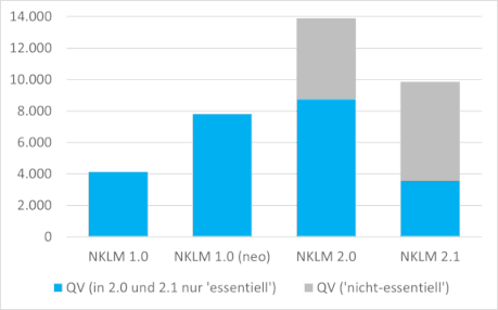 Durch die Festlegung der Zielkapitel und damit die schärfere Eingrenzung der inhaltlichen Deskriptor-Begründungen hat sich eine zusätzliche Schärfung der QV-Struktur ergeben, die zu einer Reduktion der Gesamtanzahl der QV beitrug. Dies ist daraus ersichtlich, dass die Gesamtanzahl der QV (auch ohne Auftrennung nach essenziell und nicht-essenziell) vom NKLM 2.0 zum NKLM 2.1 gesunken ist.