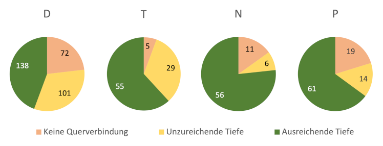 Abbildung 7: Anzahl der bei Erkrankungen im NKLM 2.0 gesetzten Deskriptoren mit fehlenden Querverbindungen, Querverbindungen unzureichender Tiefe und Querverbindungen ausreichender Tiefe