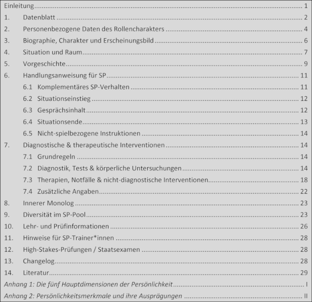 Es gibt viele Publikationen zum Umgang mit speziellen Gruppen von SP, z. B. alte Menschen, Kinder und Jugendliche oder Personen mit geistigen Einschränkungen [32], [33], [34], [35]. Im Template wurden dazu Aspekte berücksichtigt, die schriftlich in ein Rollenskript gehören. Organisatorische oder trainingsbezogene Aspekte wurden nicht aufgenommen.