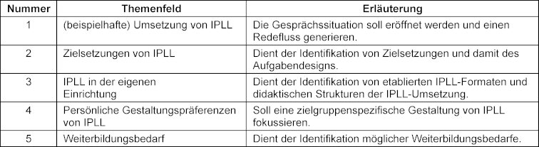 Es wurden Interviews in Form von Expert*innen-Interviews durchgeführt [6]. Die Datenerhebung richtete sich an Lehrende an beruflichen Schulen in Mecklenburg-Vorpommern (MV), welche Gesundheitsfachberufe ausbilden. Diese Personengruppe wurde als Expert*innen angesehen, da sie über spezielles Wissen der gesundheitsberuflichen Didaktik verfügt. Üblicherweise finden Expert*innen-Interviews in teilstrukturierter Form statt [6]. Daher wurde ein Interviewleitfaden entwickelt, der auf einer vorangegangenen Literaturübersicht [5] gründete und im Rahmen einer Fokusgruppe konzipiert wurde, an der die Autor*innen JV, AB und MM sowie eine wissenschaftliche Hilfskraft beteiligt waren. Der entwickelte Interviewleitfaden besteht aus fünf Themenfeldern (siehe Tabelle 1 [Tab. 1]).