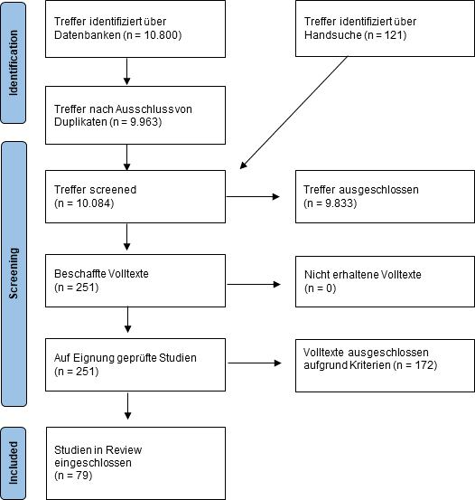 Insgesamt wurden in den Datenbanken 10.800 Studien und 121 Veröffentlichungen über die Handsuche identifiziert. Nach dem Titel/Abstract Screening und dem Ausschluss von Studien anhand der festgelegten Kriterien (siehe Tabelle 1 [Tab. 1]) konnten 79 Studien eingeschlossen werden (siehe Abbildung 1 [Abb. 1]).