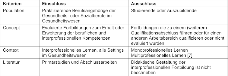 Zur Konkretisierung der Fragestellung und der Festlegung der Ein- und Ausschlusskriterien der Studien wurde das PCC-Schema (Population, Concept und Context) herangezogen [14]. Festgelegt wurde, dass sich die Veröffentlichungen auf Berufsangehörige der Gesundheitsberufe und der im Gesundheitswesen tätigen Sozialberufe (z. B. Soziale Arbeit) beziehen müssen [1], [7]. Die Fortbildungen müssen nach der Berufszulassung zum Erhalt bzw. zur Erweiterung der beruflichen Kompetenzen im beruflichen Tätigkeitsfeld stattfinden und sollen nicht, im Sinn einer Weiterbildung, mit einem zusätzlichen qualifizierenden Abschluss enden. Zudem musste die Fortbildung evaluiert worden sein. Ferner soll die Fortbildung interprofessionelles Lernen per Definition ermöglichen [7], sprich interaktive Lehr-Lernmethoden nutzen, die den Austausch der Berufsangehörigen fördern, um die interprofessionelle Zusammenarbeit und die Versorgungsqualität im Gesundheitswesen zu erhöhen.