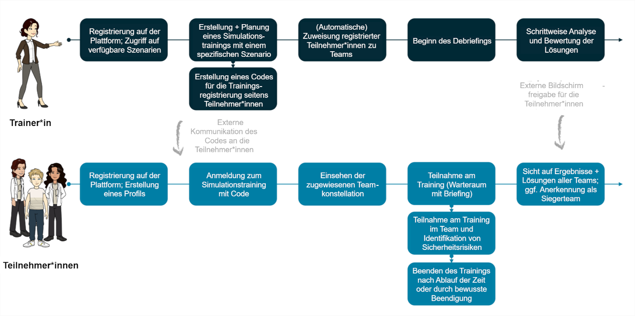 Die Anwendung verfügt über ein plattformbasiertes Design, das auf zwei Benutzergruppen zugeschnitten ist: Trainer*innen und Teilnehmer*innen (siehe Abbildung 2 [Abb. 2]). Für Trainer*innen dient die Plattform als zentraler Knotenpunkt für die Planung und Durchführung von Trainings und Debriefings. Trainer*innen registrieren sich, greifen auf virtuelle Szenarien zu und nutzen das Dashboard zur Erstellung und zeitlichen Planung von Simulationen (siehe Anhang 1 [Anh. 1], Teil 6). Teilnehmer*innen werden von den Trainer*innen entweder automatisch oder manuell über einen eindeutigen Registrierungscode, der per E-Mail oder QR-Code übermittelt wird, den Gruppen zugewiesen. Dies vereinfacht die Koordination, fördert die digitale Zusammenarbeit und reduziert den administrativen Aufwand. Die Teilnehmer*innen registrieren sich, erstellen ein Profil (siehe Anhang 1 [Anh. 1], Teil 7) und verwenden den Code, um sich für Sessions anzumelden. Die automatische Zuweisung zu einem interprofessionellen Team wird dabei im jeweiligen Profil angezeigt (siehe Anhang 1 [Anh. 1], Teil 8). Die Teilnehmer*innen betreten einen virtuellen Warteraum, erhalten ein Briefing und nehmen an der Training-Session teil, die entweder nach einer festgelegten Zeit oder auf Entscheidung des Teams endet (siehe Anhang 1 [Anh. 1], Teil 9). Die Anwendung setzt hierbei eine Videokonferenz für die Kommunikation voraus, wobei externe Tools für den Austausch von Registrierungscodes und das Debriefing der Ergebnisse zu verwenden sind. Die verbale Kommunikation während des Trainings ist von entscheidender Bedeutung, und Trainer*innen können das Debriefing nach dem Training mit einem einzigen Klick starten (siehe Anhang 1 [Anh. 1], Teil 10), gefolgt von einer schrittweisen Analyse und Bewertung.