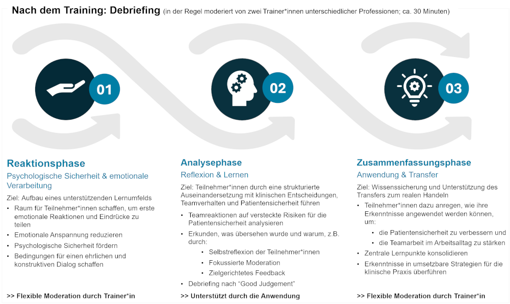 - Das Debriefing ist in den Trainingsprozess eingebettet, bietet einen geführten Zugang zu den Teamdokumentationen und ermöglicht eine Reflexion, die von Trainer*innen flexibel moderiert werden kann.