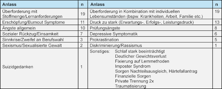 • Aus den beschriebenen Belastungserfahrungen resultierende Auswirkungen wie wachsenden Lernrückstände, Lernblockaden, Motivationsverlust oder das Nicht-Bestehen von Prüfungen.