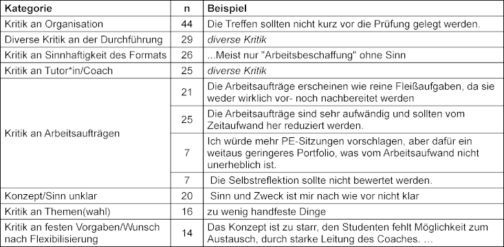 Die Zufriedenheit mit dem PE-Pfad in den ersten Jahren des Studiengangs waren sehr uneinheitlich, mit großen Schwankungen zur Bewertung des Formats (Schulnoten 2,3-3,6) und der Tutor*innen (1,8-3,8) zwischen Modulen und Kohorten (siehe Anhang 1 [Anh. 1]). Aufgrund der bereits geschilderten, wechselnd gestalteten Fragebögen ist eine zusammenfassende Auswertung der Items über die Jahre nicht möglich. Aus den Freitexten der Jahre 2013-2015 (371 Freitextkommentare) lassen sich jedoch Aussagen herausarbeiten. Insgesamt gab es 303 kritische Freitexte und 53 positive Anmerkungen.