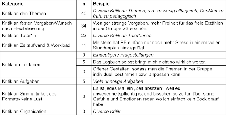 Positiv hervorgehoben wurden die Atmosphäre in den Gruppen, die Tutor*innen, die Reflexion der Praxiseinsätze und die Möglichkeit zur Selbstreflexion, siehe Tabelle 2 [Tab. 2].