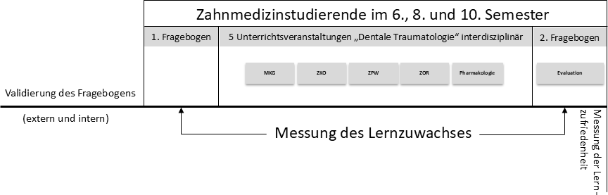 Die originäre Planung des Lehrmoduls sah vor, die Studierenden zu Beginn des Semesters randomisiert einer Studien- oder Kontrollgruppe zuzuweisen. Den Studierenden der Kontrollgruppe sollten die interdisziplinären Vorlesungsinhalte vermittelt werden, wohingegen in der Studiengruppe zusätzlich ein Kleingruppenunterricht in Seminargröße mit Hands-On-Übungen geplant war. Dieser praktische Unterricht sollte ein simuliertes Anamnesegespräch, eine systematische Befunderhebung über den Befundbogen Zahntrauma der Deutschen Gesellschaft für Endodontologie und zahnärztliche Traumatologie (DGET), die praktische Durchführung einer Pulpotomie an einem frakturierten Frontzahn mit anschließender adhäsiver Versorgung und das Repositionieren von einem dislozierten Zahn mit Hilfe eines TTS umfassen. Der Lernerfolg sollte in der Studiengruppe zusätzlich mit einer OSCE-Prüfung (objective structured clinical examination) am Semesterende überprüft werden [17].