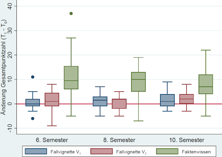 Abbildung 2: Differenz der Gesamtpunktzahl (T1-T0) für die beiden Fallvignetten und das Faktenwissen aufgeteilt nach Semester dargestellt als Boxplots.