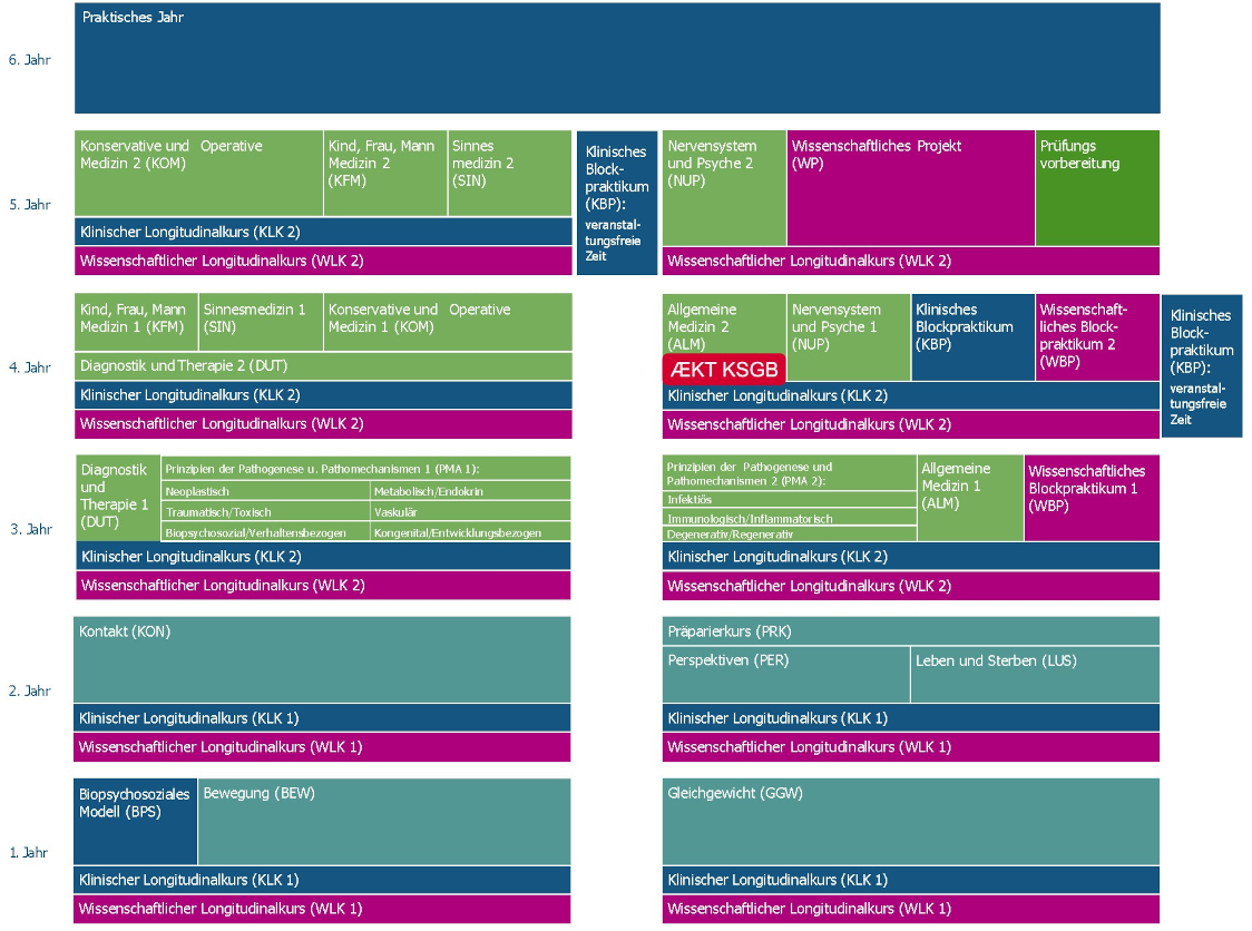 Der Modellstudiengang Humanmedizin der Universität Augsburg startete im WiSe 2019/20. Die Lehre erfolgt in organ- und systemorientierten Modulen (horizontale Integration) mit im Studienverlauf ansteigender Komplexität (vertikale Integration) [18]. Klinische und wissenschaftliche Kompetenzen werden durch Longitudinalkurse vermittelt. Planetary Health ist im Kern- als auch Wahlcurriculum verankert. Inhalte der Ethik und der Kommunikation haben Schwerpunkte in den ersten Studienjahren, werden aber über den gesamten Studienverlauf unterrichtet. Eine Reihe von ÆKTs für verschiedene Themen, z.B. zum Thema „Zufallsbefunde“ wird über das Studium hinweg unterrichtet (siehe Abbildung 1 [Abb. 1]).