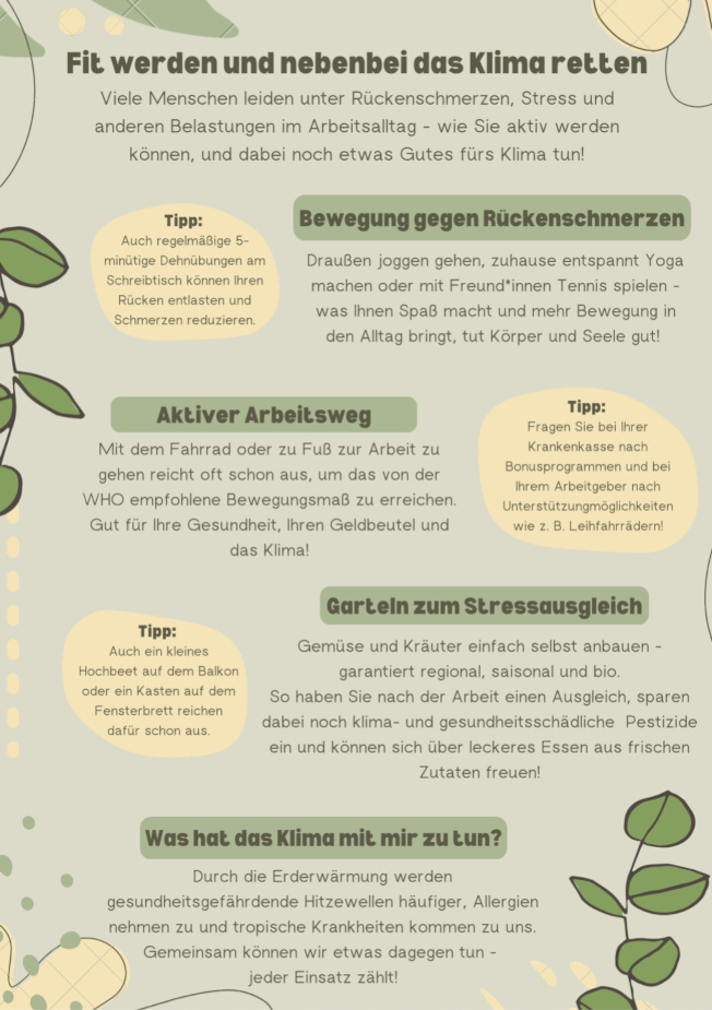 In diesem Lehrkonzept wird das Konzept der KSGB vermittelt [14], [15]. Medizinstudierende wenden Wissen zum Zusammenhang von gesundheitlichen Auswirkungen der menschengemachten Umwelteinflüsse/-belastungen und individuellen Lebensstilen an. Die zu erwerbenden Handlungskompetenzen umfassen kommunikative Fähigkeiten sowie die Befähigung zur inhaltlichen Beratung. Zudem sollen die Studierenden eine ethisch reflektierte Haltung entwickeln. Die Studierenden erstellen in Gruppen jeweils ein Kommunikationsprodukt (z.B. Flyer, Wartezimmerplakat), das Arztpraxen bereitgestellt wird.