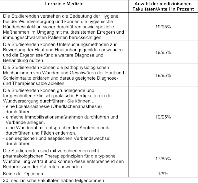 Obwohl im NKLM [https://nklm.de/zend/menu] relevante Lernziele zur Wundversorgung definiert sind und – wie die Ergebnisse zeigen – diese auch in der Breite, wenn auch sehr unterschiedlich, gelehrt werden, stellt sich die Frage, ob sowohl deren Anzahl als auch deren inhaltliche Tiefe ausreichen, um den gestiegenen Anforderungen an die Versorgung chronischer Wunden gerecht zu werden. Studien legen nahe, dass vertiefende und praxisnahe Lehrangebote zur Wundversorgung eine sinnvolle Ergänzung im Medizinstudium darstellen können [10], [11].
