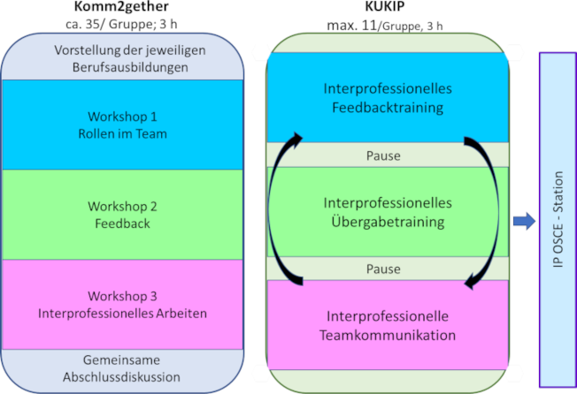 Unsere IP-Lehreinheit wurde in 2 Abschnitte aufgeteilt (siehe Abbildung 1 [Abb. 1]). Im 1. Teil der Lehreinheit (Komm2gether) sollen theoretische Grundlagen aufgebaut und für das Thema sensibilisiert werden. Im 2.Teil der Lehreinheit (KUKIP) wurden auf den vermittelten Inhalten aufbauend praktische Trainingseinheiten in kleinen IP-Gruppen durchgeführt.