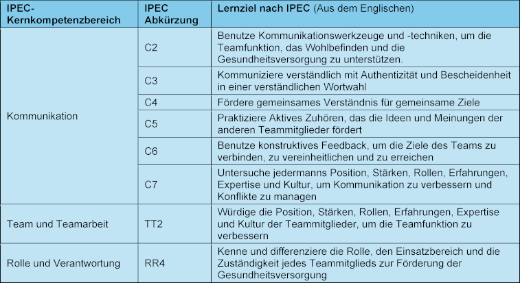 Im Nationalen Kompetenzorientierten Lernzielkatalog Medizin (NKLM) sowie im Pflegeberufegesetz wurden IP-Lernziele als übergeordnete Kompetenzen [14], [15] für alle MS und PA aufgenommen, bestehend aus den 4 Kernkompetenzbereichen des IPEC. Ruebling et al. konnten zeigen [14], dass ein früher Einsatz von IP-Kursen Haltungen zu anderen GHB nachhaltig verändern können.