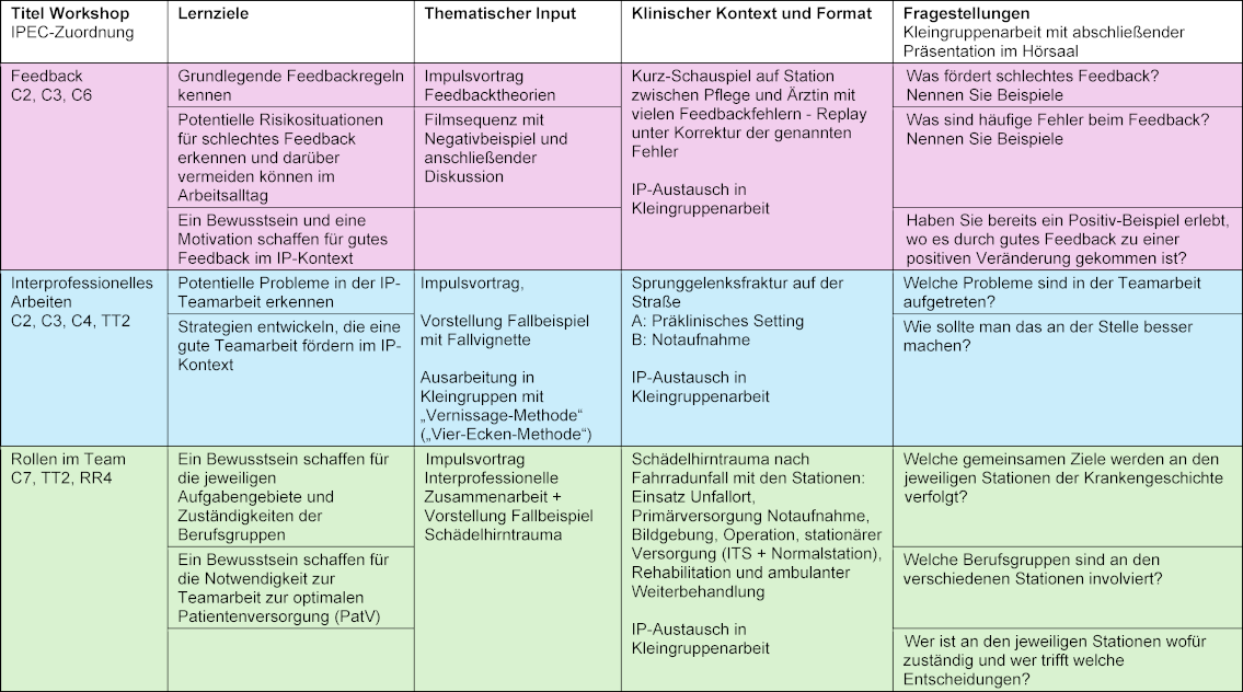 Die Bedarfsanalyse zeigt für unseren Standort im klinischen Abschnitt M2 einen großen Bedarf an IP-Lehreinheiten. Auf Initiative des Studiendekanates wurde durch die Gründung einer Arbeitsgruppe mit Pflegekräften der Abteilung für Personalentwicklung (Pflegestudium und -ausbildung), Mitglieder des Studiendekanates, Fachärztin für Innere Medizin, MS und Ausbilder*innen der NotS die Infrastruktur zur Entwicklung und Etablierung von IP-Lehreinheiten geschaffen. In der AG wurde ein Konzept aufeinander aufbauenden Lehrveranstaltungen entwickelt, das nach IPEC die Förderung des gegenseitigen IP-Rollenverständnisses und der IP-Kommunikation mit den Schwerpunkten Teamkommunikation, Feedback und Übergabe in den Blick nimmt. Die Kompetenzdomäne „Teamarbeit“ wurde aufgrund des frühen Ausbildungsstadiums, der Kohortengröße und des begrenzten zeitlichen Rahmens nur auf Kompetenztiefe 2 nach NKLM vermittelt, „Werte und Ethik“ zurückgestellt, da die AG die Passung von Lerninhalt sowie Ausbildungs- und Erfahrungsstand der Teilnehmer*innen (TN) nicht gegeben sah.