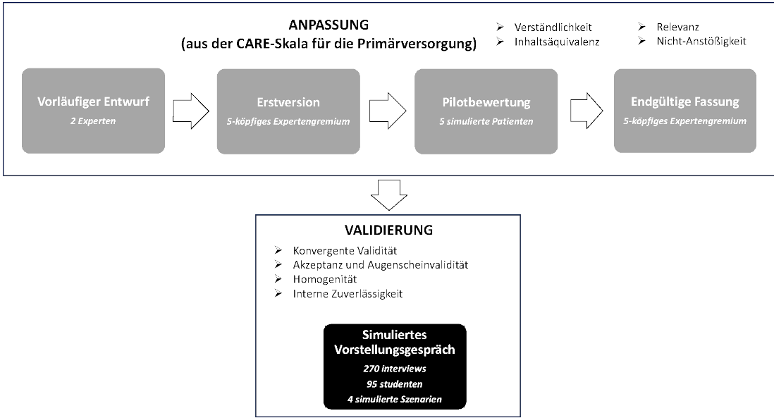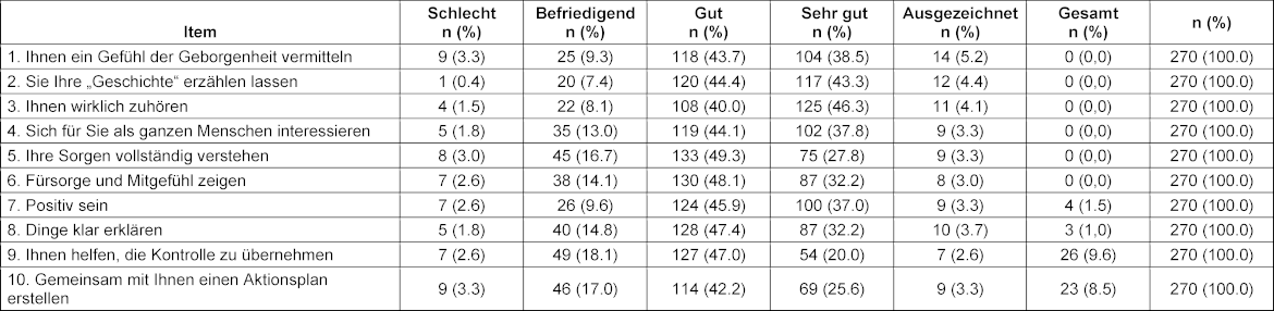 Ergebnisse: Der Anpassungsprozess führte zu einer klaren, relevanten und verständlichen Skala, die ein einheitliches Verständnis unter den Anwendern gewährleistet. An der Validierung nahmen 95 Studierenden in 270 Begegnungen mit acht simulierten Patient:innen teil. Die endgültige Version zeigte konvergente Validität (Spearman’s rho=0,730, p<0,001), Akzeptanz und Augenscheinvalidität (1,96% „trifft nicht zu“/fehlende Werte), Homogenität (Item-Gesamt-Korrelationen 0,705-0,865) und Reliabilität (Cronbach’s Alpha=0,960).