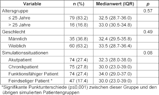 Tabelle 2: Demografische Daten der Medizinstudenten und Sp-SIMCARE-Werte nach Altersgruppe, Geschlecht und simuliertem Szenario