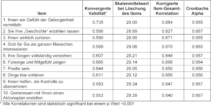 Das CARE-Maß wurde 2004 entwickelt und validiert und zeigt eine starke Korrelation mit anderen empathiebezogenen Skalen sowie eine hohe interne Reliabilität (Cronbachs Alpha, 0,93) [12]. Die Skala besteht aus 10 Items, die auf einer Likert-Skala von „1“ (schlecht) bis „5“ (ausgezeichnet) bewertet werden, wobei höhere Werte ein höheres Maß an Empathie innerhalb eines Bereichs von 10 bis 50 bedeuten. Die Entwickler der Messung schlagen vor, dass die Items 1 bis 6 in erster Linie mit dem affektiven Aspekt der Empathie zusammenhängen, während die übrigen Items mit kognitiven und verhaltensbezogenen Aspekten zusammenhängen. Für jeden Punkt gibt es auch die Option „trifft nicht zu”, die ausgewählt werden kann, wenn der Punkt für die Konsultation als irrelevant erachtet wird. Eine minimale Anzahl von „trifft nicht zu”-Antworten oder fehlenden Antworten zeigt somit die vom Patient*innen wahrgenommene Relevanz des Punktes. Um die praktische Anwendbarkeit zu gewährleisten, empfehlen die Entwickler von CARE, maximal zwei „trifft nicht zu”-Antworten oder fehlende Antworten pro Messung zuzulassen und alle Messungen mit mehr als zwei Antworten dieser Art bei der Analyse zu ignorieren. Bei bis zu zwei nicht zutreffenden oder fehlenden Antworten schlagen sie vor, diese Antworten mit der Durchschnittspunktzahl der übrigen Items der Maßnahme, also einer mittleren Item-Punktzahl, zu bewerten. Die Validierung der CARE-Maßnahme im Jahr 2004 ergab eine starke konvergente hohe interne Reliabilität (Cronbachs Alpha, 0,93). Im Jahr 2020 wurde die CARE-Maßnahme für den Einsatz in spanischsprachigen Hausarztpraxen angepasst und validiert (Sp-CARE) [24] und zeigte eine hohe Akzeptanz und Augenscheinvalidität (1% nicht zutreffende oder fehlende Antworten), eine starke Homogenität (korrigierte Item-Gesamt-Korrelationen > 0,30) und eine robuste interne Reliabilität (Cronbachs Alpha, 0,95).