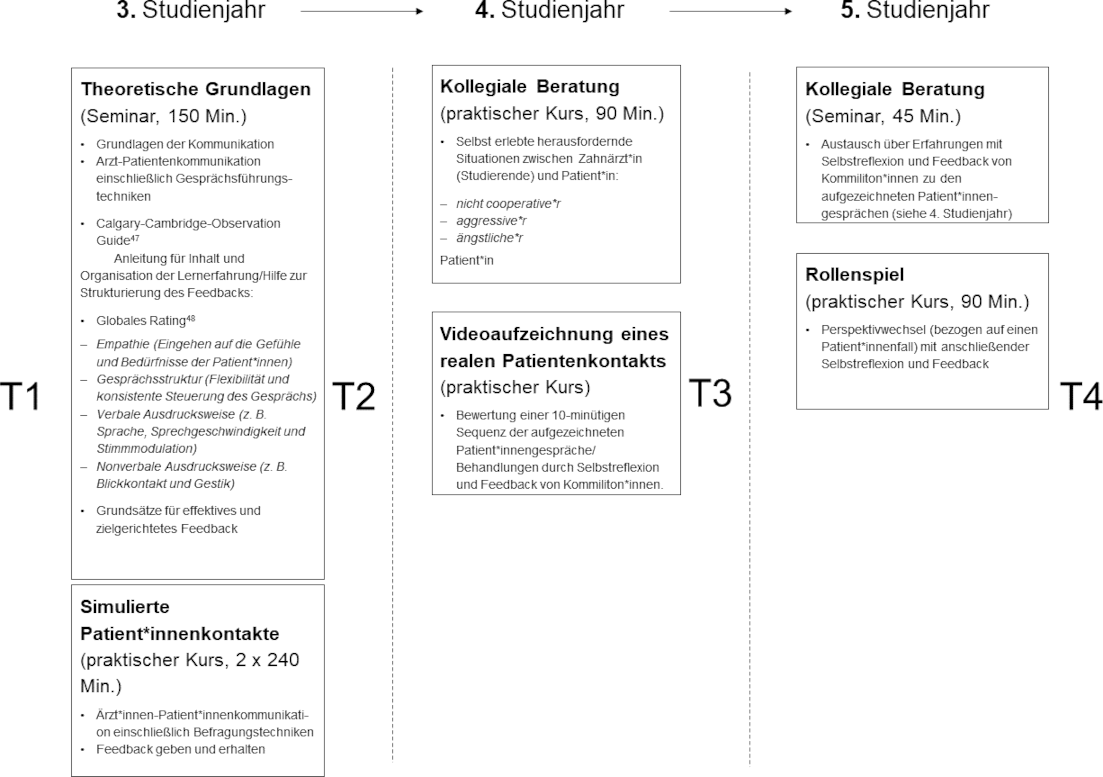 Trotz der Verfügbarkeit verschiedener Ansätze fehlte bislang ein umfassendes longitudinales Kommunikationscurriculum für Zahnmedizinstudierende, welches praktische Elemente, videobasiertes Peer-Feedback und systematische Selbstreflexion miteinander verbindet. Die vorliegende Studie wurde daher konzipiert, um diese Lücke zu schließen. An einer deutschen medizinischen Fakultät wurde ein longitudinales Kommunikationscurriculum für Zahnmedizinstudierende eingeführt und evaluiert, wobei mehrere evidenzbasierte Lehrmethoden zum Einsatz kamen, um differenziertes und nachhaltiges Lernen zu unterstützen.
