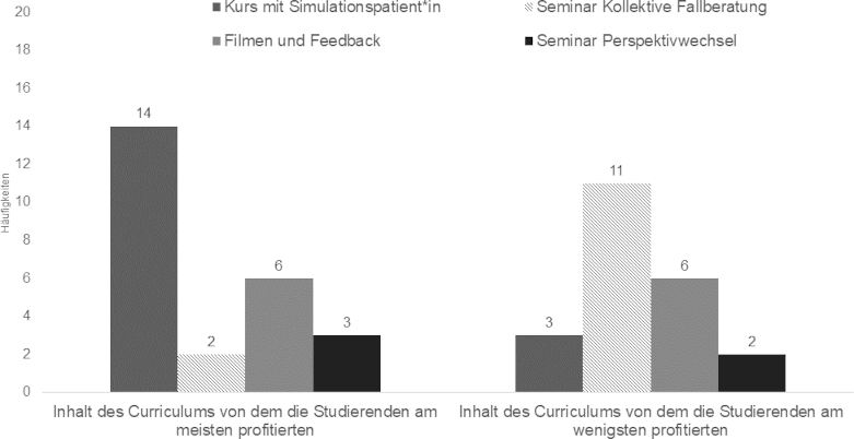 Die Studierenden gaben bei T4 an, dass sie am meisten von der Begegnung mit dem SP profitiert hätten (n=14), während die Peer-to-Peer-Konsultation (Kollegiale Fallberatung) der Kurs war, von dem die Studierenden angaben, am wenigsten profitiert zu haben. Das Filmen der eigenen Behandlung mit anschließendem Feedback und der Perspektivwechsel wurden widersprüchlich bewertet (siehe Abbildung 2 [Abb. 2]).