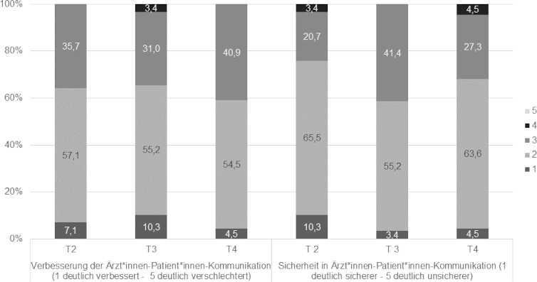 Nach der Peer-to-Peer-Konsultation wurde das Curriculum von 62% als hilfreich für das Erlernen der Kommunikation zwischen Patient*innen und Zahnärzt*innen bewertet; 73% fanden das Curriculum zum letzten Erhebungszeitpunkt T4 hilfreich oder sehr hilfreich.