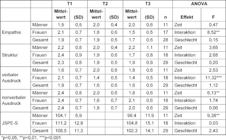 Zur Analyse dieser geschlechtsspezifischen Veränderungen im Laufe der Zeit in Bezug auf Empathie und kommunikativer Fähigkeiten wurde eine Zwei-faktorielle-ANOVA mit Messwiederholungen durchgeführt.
