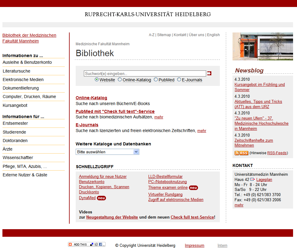 Abbildung 9: Die Homepage der Bibliothek der Medizinischen Fakultät Mannheim März 2010