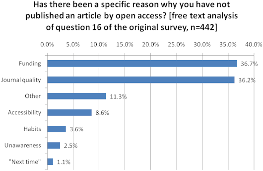 Abbildung 7: Die Wissenschaftler konnten in einem Freitextfeld Gründe nennen, weshalb sie noch keinen Open Access-Artikel publiziert haben. Insgesamt 442 Gründe wurden genannt und in Themengruppen zusammengefasst. Beinahe gleich wichtig war dabei die fehlende Finanzierung und die Qualität der Zeitschriften.