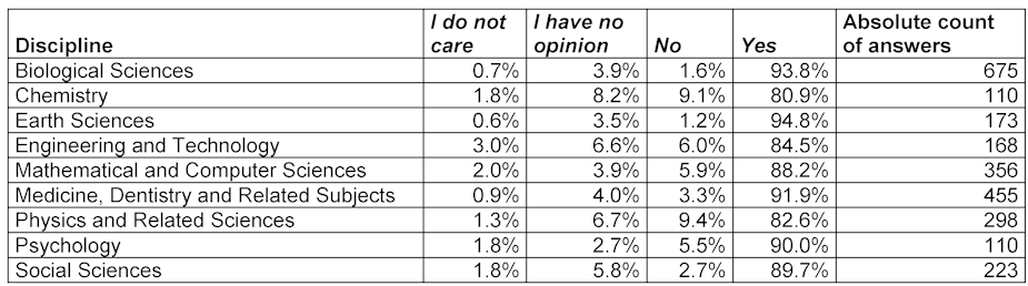 Es haben zahlreiche in Deutschland arbeitende Wissenschaftler sowohl aus den Naturwissenschaften als auch aus den Geistes- und Sozialwissenschaften geantwortet. Die umfangreiche Datenlage erlaubt es, einen tieferen Einblick in die unterschiedlichen Disziplinen zu bekommen. Dabei wurden nur die Disziplinen mit mehr als 100 Antworten herangezogen.