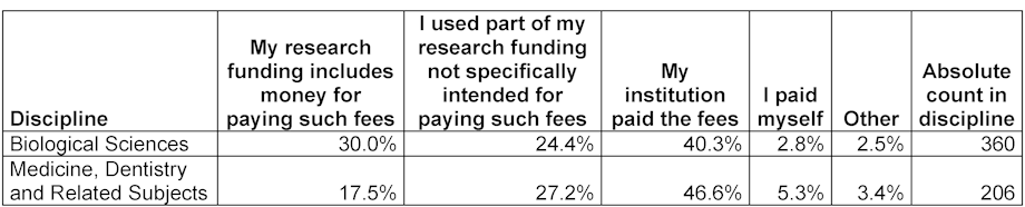 Von den Universitäten haben 447 Wissenschaftler auf diese Frage geantwortet. 31,3% nutzten dafür vorgesehene Fördergelder, 30,4% nutzten Teile von Fördergeldern, die nicht speziell für die Bezahlung dieser Gebühren vorgesehen waren und 31,3% geben an, dass ihr Institut/ihre Universität die Gebühren gezahlt hat.