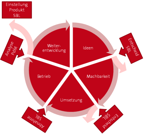 Eine der ersten Aufgaben des Innovationsmanagements bestand darin, den Innovationsprozess zu gestalten. An der ETH-Bibliothek war vor einiger Zeit das Projektmanagement mit klar strukturierten Abläufen und Verantwortlichkeiten erfolgreich eingeführt worden. Der Innovationsprozess lehnte sich sehr stark an diese etablierte Struktur und Methodik an. Es wurde ein Vorgehen festgelegt, das regelmässige Entscheidungspunkte durch die Geschäftsleitung vorsah. So entscheidet die Geschäftsleitung (SBL, Sitzung der Bibliotheksleitung) über die Umsetzung eingegangener Ideen, über die Abnahme von Machbarkeitsstudien und die Genehmigung eines Projekts zur Umsetzung sowie über die Abnahme von Projekten und deren Übergabe in den Betrieb.