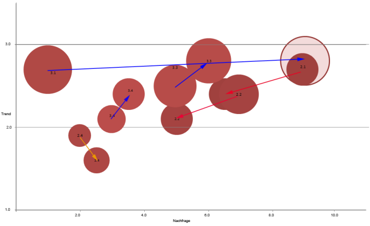 Abbildung 3: Produktportfoliomatrix mit Veränderungen gegenüber Vorjahr (Ausschnitt) blau: Produkte mit gesteigerter Nutzung und zunehmendem Trend: 3.1 Wissensportal, 3.3 digitalisierte Zeitschriften, 3.4 Archivdatenbank orange: Produkt mit gesteigerter Nutzung und sinkendem Trend: 2.4 Führungen rot: Produkte mit sinkender Nachfrage und sinkendem Trend: 2.1 Online-Publikationen (virtuelle Ausstellungen etc.), 2.2 Fachinformation