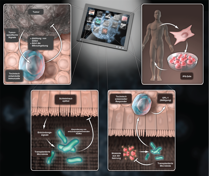 Obwohl niedermolekulare Medikamente und Biologika stets eine wichtige therapeutische Nische besetzen werden, gibt es zahlreiche Anwendungen, für die Zellen besser ausgestattet sind. Vier Killer-Anwendungen für zellbasierte Therapeutika werden dargestellt: zur Erkennung und Abtötung von Tumorzellen entwickelte Immunzellen; transplantierte Mikrobiota, die Darmentzündungen (z.B. Morbus Crohn) erkennt und behandelt, indem sie ein entzündungshemmendes kleines Molekül oder Biologikum bildet; eine Kombination aus Bakterien-/Säugetierzellen-Therapeutikum, bei dem die Bakterienzelle die in der Nahrung enthaltenen Zuckermoleküle in ein nicht absorbierbares Fermentationsprodukt umwandelt und die Produktion eines sättigungseinleitenden Hormons durch das begleitende menschliche Zelltherapeutikum aktiviert wird; und patientenspezifische Stammzellen für die regenerative Medizin (in diesem Artikel nicht besprochen, siehe [4]). iPS-Zellen, induzierte pluripotente Stammzellen.
