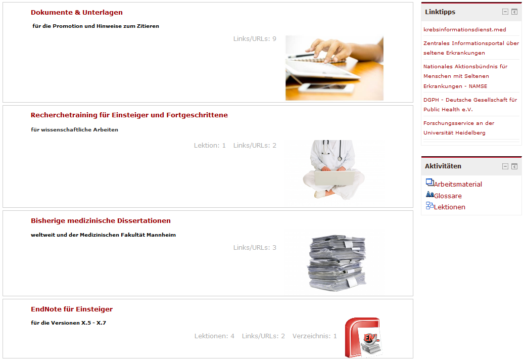Ein speziell auf die Zielgruppe der Doktoranden zugeschnittener „Doktorandenkurs. Promovieren an der Medizinischen Fakultät Mannheim“ ergänzt seit Juni 2012 das fakultative Angebot und wird ebenso von Studierenden höherer Semester und Teilnehmern der Master-Studiengänge besucht. Ausgangspunkt für die Entwicklung des Kurses war die Beobachtung, dass es zuvor zwar Doktorandenkurse einzelner Kliniken der Universitätsmedizin Mannheim gab, diese aber ausschließlich der Literaturdiskussion dienten, während ein Fakultätsangebot zur Einführung in das wissenschaftliche Arbeiten fehlte. Die Bibliothek setzte sich zum Ziel, diese Lücke mit der Entwicklung eines neuen Kurses zu schließen, der die Abläufe des Promotionsprozesses strukturiert vermitteln und darüber hinaus die in den curricularen Bibliothekskursen früh vermittelten Inhalte zur Literaturrecherche und verwaltung auffrischen sollte. Zur Bedarfsermittlung wurden die Ergebnisse der Diskussion von Kurskonzepten für Doktoranden bei der Jahrestagung 2011 der Arbeitsgemeinschaft für Medizinisches Bibliothekswesen – AGMB e.V. ebenso genutzt wie die Rückmeldungen auf gezielte Anfragen im Kollegenkreis, die über Mailinglisten wie MEDIBIB-L gestellt worden waren. Die Sichtung von Best-Practice-Beispielen an Bibliotheken sowie eine Umfrage bei ausgewählten Doktoranden der Fakultät ergänzten die Angebots- und Bedarfsanalyse.