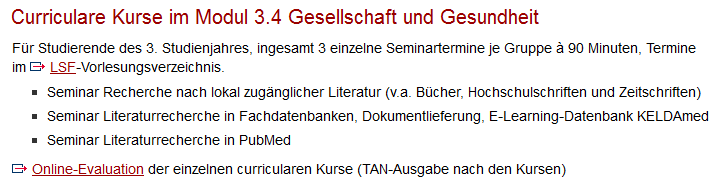 Die anwesenheitspflichtigen Kurse der Bibliothek orientieren sich hinsichtlich der Recherchethemen inhaltlich an den Wochenthemen des Moduls – beispielsweise „Umwelt und Arbeit“, „Psychosoziale Dimension der Gesundheit“, „Prävention und Gesundheitsförderung“ – und erhalten dadurch von Seiten der Zielgruppe erhöhte Aufmerksamkeit, da in den Kursen Literatur zu bekannten Themen recherchiert wird. Die Konzeption dieser curricular integrierten Kurse erfolgte im Rahmen von Planungs-Meetings mit den für die Lehre in diesem Modul verantwortlichen Professoren und Dozenten, um eine maximale Qualität der Vernetzung der einzelnen Veranstaltungen zu erreichen. So werden alle Lehreinheiten im Seminarstil mit maximal 25 Teilnehmern gehalten und sind inhaltlich aufeinander abgestimmt. Als gemeinsames Arbeitsinstrument erfolgte die Erstellung eines Modul-Steckbriefes, in welchem die an der Durchführung der Lehrveranstaltungen Beteiligten die Lernziele der einzelnen Fächer (Sozialmedizin, Notfallmedizin, Gesundheitsökonomie, Umweltmedizin, Biometrie) festhielten. Dieser Modul-Steckbrief wiederum wird je nach Bedarf und aktuellen Entwicklungen vor Beginn eines neuen Studienjahres aktualisiert. Ebenso finden einmal pro Jahr Evaluations-Meetings der Lehrverantwortlichen für jeden der o.g. Teilbereiche des Moduls „Gesellschaft & Gesundheit“ statt.