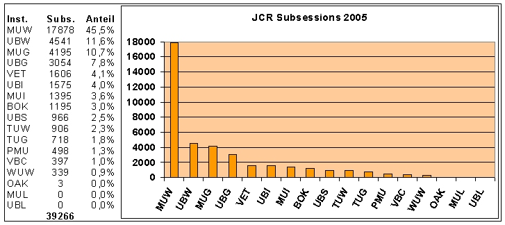 Die Auswertung bezieht sich auf die vom ISI Usage Reporting System registrierten Subsessions der fünf Datenbanken im Jahre 2005. Diese wurden auf die am Konsortium teilnehmenden Institutionen nach dem Stand ihrer IP-Adressbereiche aufgeteilt. Die absoluten Zugriffszahlen wurden als Balkendiagramme dargestellt. Der prozentuelle Anteil der Zugriffe einer Institution im Verhältnis zur konsortialen Gesamtnutzung der jeweiligen Datenbank wurde errechnet: