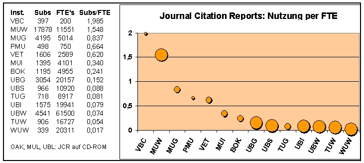 Die Darstellung der Zugriffszahlen bezogen auf die Anzahl der angestellten Wissenschaftler wurde ansatzweise getestet, führte aber zu keinen klaren Aussagen oder Gruppierungen im Vergleich zur Verwendung der FTEs. Der 2003 für das Konsortium ausgehandelte Kostenaufteilungsschlüssel berücksichtigte noch beide Nutzergruppen getrennt. Wie diese Untersuchung aber auch die Praxis der letzten Verhandlungstreffen zeigte, sollte hier nur mehr die Zahl der FTEs einfließen.